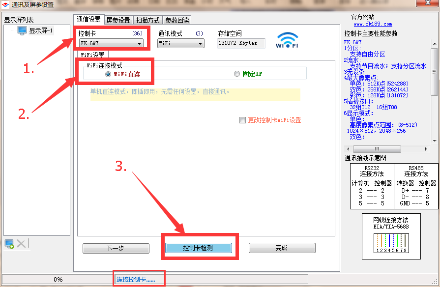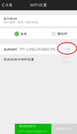 选择控制卡,WiFi连接模式"WiFi直连"点击检测控制卡